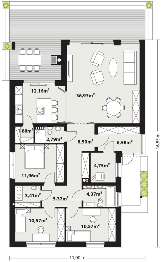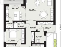 Aron to parterowy dom z trzema sypialniami na wąską (19m) działkę. Posiada trzy sypialnie i wysoką część dzienną z półotwartą kuchnią z możliwością pełnego zamknięcia. Posiada także praktyczne pomieszczenia pomocnicze jak spiżarnia, pralnia, kotłownia. Dom ten swym charakterem wpisywać się będzie zarówno w zabudowę podmiejską jak i typowo wiejską. Łączy w sobie tradycyjny dach spadzisty i naturalne materiały elewacji z nowoczesnymi przeszkleniami i otwarciem salonu po skosy dachu. Dużym atutem tego projektu jest zadaszony taras dostępny z kuchni i salonu z możliwością zrobienia tam paleniska/grilla. Aron to średniej wielkości, prosty i funkcjonalny dom o ponadczasowym wyglądzie.