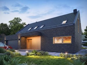 Dom jednorodzinny, parterowy, niepodpiwniczony, z dwustanowiskowym garażem. Wygodny, z przestronną i otwartą częścią dzienną oraz wydzieloną częścią nocną z trzema sypialniami, łazienką i garderobą. Posiada duże przeszklenia w salonie i jadalni z wyjściami na zadaszony taras. Kominek w salonie jest zgrabnie schowany w ścianę przez co nie pomniejsza go. Kuchnia posiada spiżarnię, w domu dodatkowo przewidziano wiele miejsca na szafy i schowki. Duża kotłownia oraz pomieszczenie na skład opału pozwola na montaż kotła na dowolny rodzaj paliwa. Dostępna jest również wersja z kątem dachu 30 stopni