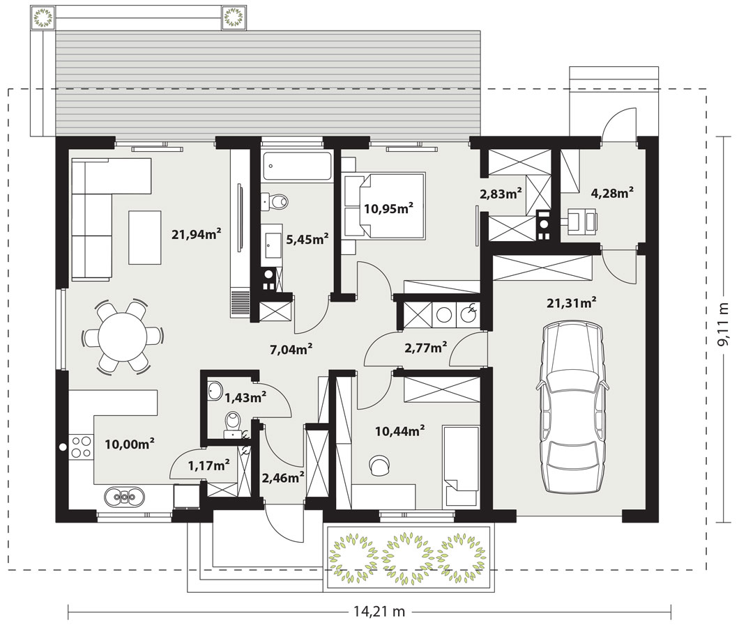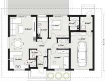 Galia 2 drewniana to niewielki dom parterowy na rzucie prostokąta przykryty kopertowym dachem. Swoim wyglądem zewnętrznym projekt idealnie wpisuje się zarówno w klimat dużych miast, jak i spokojnej wsi. Prostota jego budowy oraz niewielka zwarta bryła przekłada się na niższe koszty budowy oraz na zmniejszenie kosztów późniejszej eksploatacji. Układ funkcjonalny domu został podzielony na 3 strefy. Część dzienną stanowi duża otwarta przestrzeń, w której znajduje się kuchnia, jadalnia, salon oraz wc. Kuchnia wzbogacona została o spiżarnię. W części intymnej znajdują się dwie sypialnie, łazienka oraz przechodnie pomieszczenie gospodarcze, które może pełnić funkcję pralni. Głowna sypialnia posiada własną garderobę. Część gospodarcza domu to garaż i kotłownia. Tak wyraźne podzielenie powierzchni na strefy jest wyjątkowo korzystne w domach o niewielkim metrażu gdzie życie toczy się na jednym poziomie kondygnacji. Atutem projektu jest też możliwość wyjścia na taras z salonu i z głównej sypialni. Galia 2 drewniana to również dom o bardzo ciekawym wyglądzie zewnętrznym, którego charakter został osiągnięty poprzez współczesne ujęcie architektury. Elewacje zaprojektowano na zasadzie kontrastu, gdzie ciemny antracytowy tynk zestawiono z drewnianym płytami elewacyjnymi. Dzięki tradycyjnej bryle, ale i nowoczesnym elewacjom, Galia 2 drewniana może się spodobać zarówno inwestorom poszukującym domu bardziej klasycznego, jak i tym otwartym na współczesne spojrzenie na architekturę.