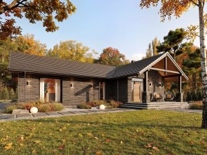 Leon 2 to parterowy dom jednorodzinny w stylu nowoczesnej stodoły o bardzo ciekawej architekturze. Jego centralnym punktem jest całkowicie przeszklona część dzienna. Rozbija ona tę prostą bryłę na rzucie prostokąta przykrytego dwuspadowym dachem i swoją otwartością i jasnością stanowi kontrast do reszty bryły domu w ciemnej szalówce. Przestrzeń dzienna nie tylko pozwala na szereg aranżacji wnętrza ale umożliwia także na przenikanie poprzez przeszklenia i tarasy, otaczającej przyrody. Mimo tak ciekawej części dziennej dom charakteryzuje się prostym, funkcjonalnym układem pomieszczeń, który swoim programem zapewnia optymalny komfort 4-osobowej rodzinie. Od frontu budynku przewidziano część gospodarczą domu – przestronny wiatrołap i hol, kotłownię, łazienkę, spiżarnię oraz dwustanowiskowy garaż. W strefie nocnej po drugiej stronie budynku zaprojektowano dwie sypialnie dzieci, łazienkę, pralnię oraz sypialnię rodziców z własną łazienką i garderobą. W domu Leon 2 idealnie połączono prostą, bryłę z przyciągającym uwagę otwarciem w części dziennej, co może się spodobać zarówno inwestorom poszukującym domu bardziej klasycznego jak i tym otwartym na współczesne spojrzenie na architekturę.