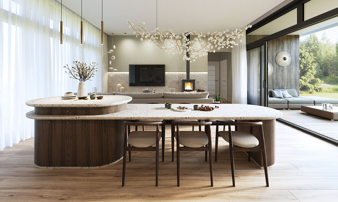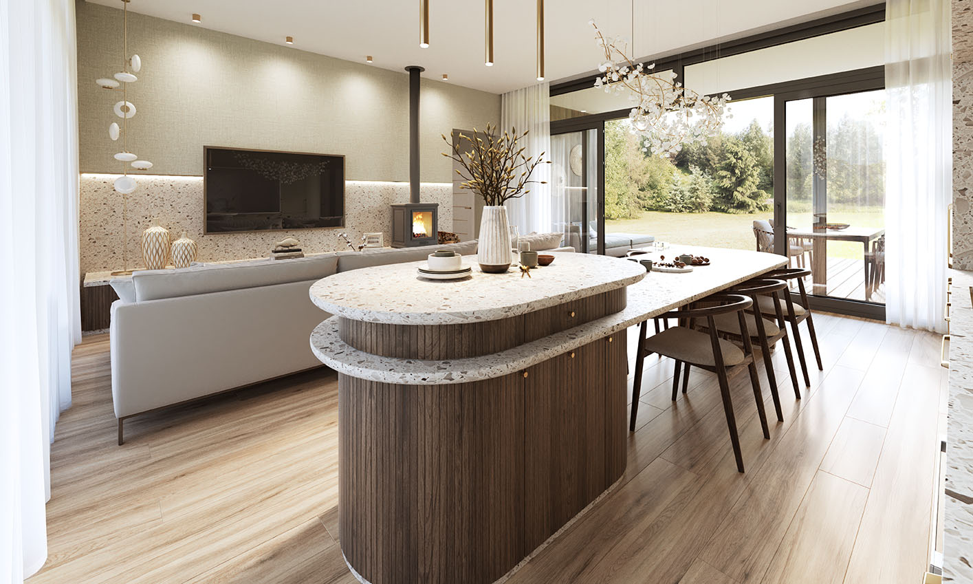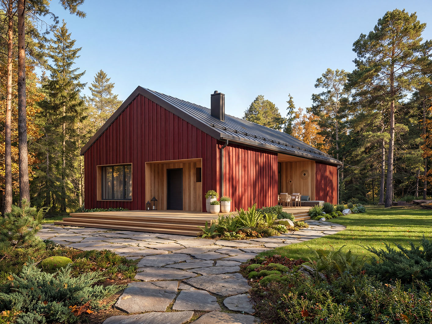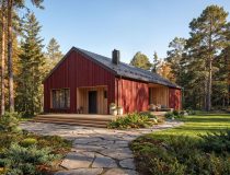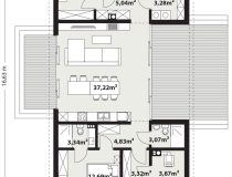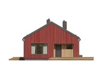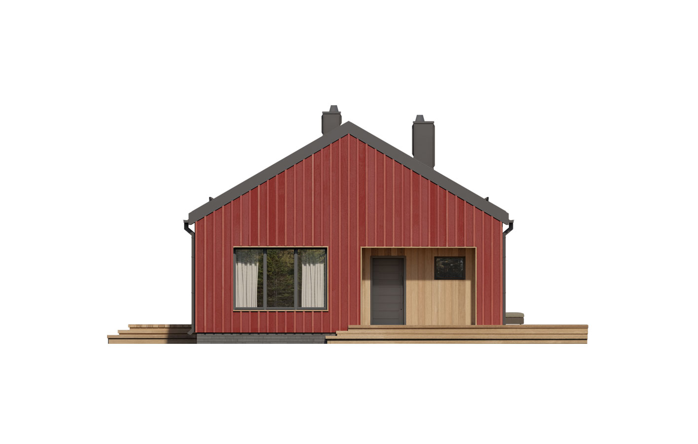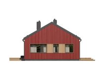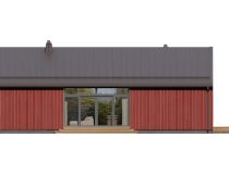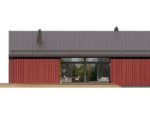 Mati drewniany to parterowy dom jednorodzinny w stylu nowoczesnej stodoły o bardzo ciekawej architekturze. Jego centralnym punktem jest całkowicie przeszklona część dzienna. Rozbija ona tę prostą bryłę na rzucie prostokąta przykrytego dwuspadowym dachem. Przestrzeń dzienna nie tylko pozwala na szereg aranżacji wnętrza ale umożliwia także na przenikanie poprzez przeszklenia i tarasy, otaczającej przyrody. Mimo tak ciekawej części dziennej dom charakteryzuje się prostym, funkcjonalnym układem pomieszczeń, który swoim programem zapewnia optymalny komfort 4-osobowej rodzinie. Od frontu budynku przewidziano wiatrołap i hol, kotłownię, łazienkę oraz sypialnię rodziców z łazienką. W strefie nocnej po drugiej stronie budynku zaprojektowano dwie sypialnie dzieci, łazienkę, pralnię oraz długi korytarz z szeregiem szaf. Bryła jest zaprojektowana w ciekawej kolorystyce czerwonego drewna przełamanego szalówką w naturalnym kolorze. W domu Mati drewniany idealnie połączono prostą, bryłę z przyciągającym uwagę otwarciem w części dziennej, co może się spodobać zarówno inwestorom poszukującym domu bardziej klasycznego jak i tym otwartym na współczesne spojrzenie na architekturę.