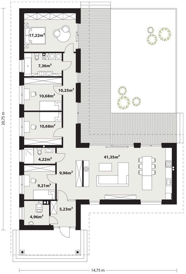 Stella 2 to parterowy dom jednorodzinny w stylu tradycyjnym o nowoczesnym układzie funkcjonalnym.