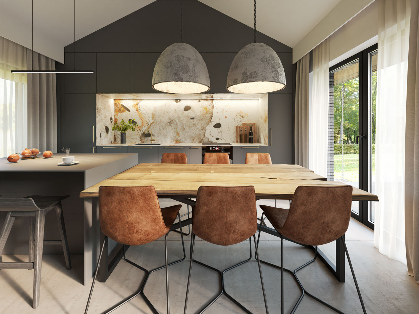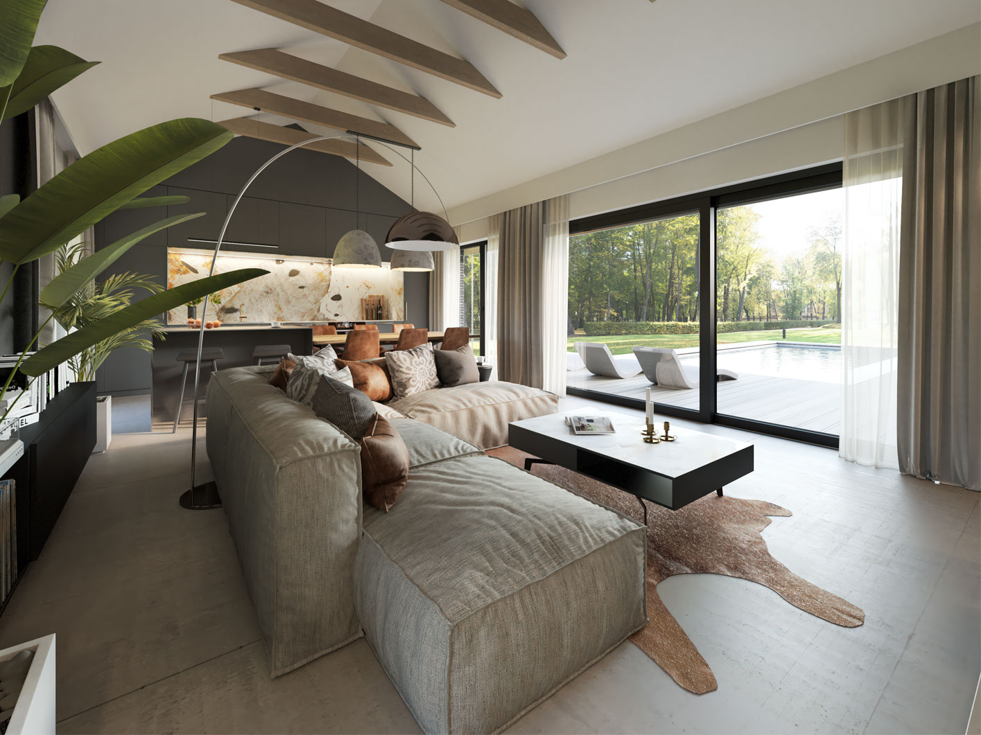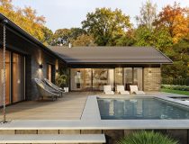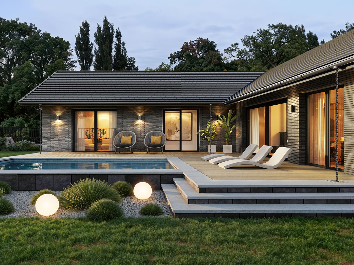 Budynek tworzą dwie przenikające się bryły dzielące strefy na dzienną i nocną. Taki układ pozwolił na wydzielenie dużego prywatnego ogrodu z tarasem dostępnym z każdego przyległego pomieszczenia.