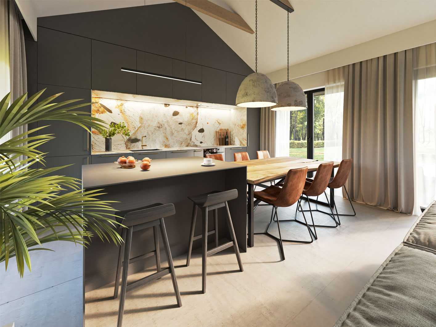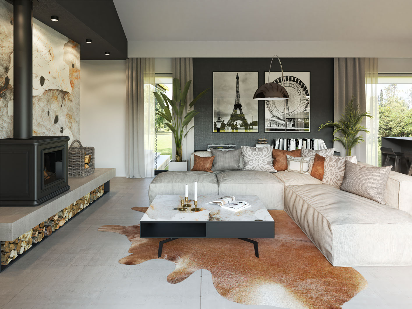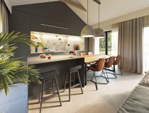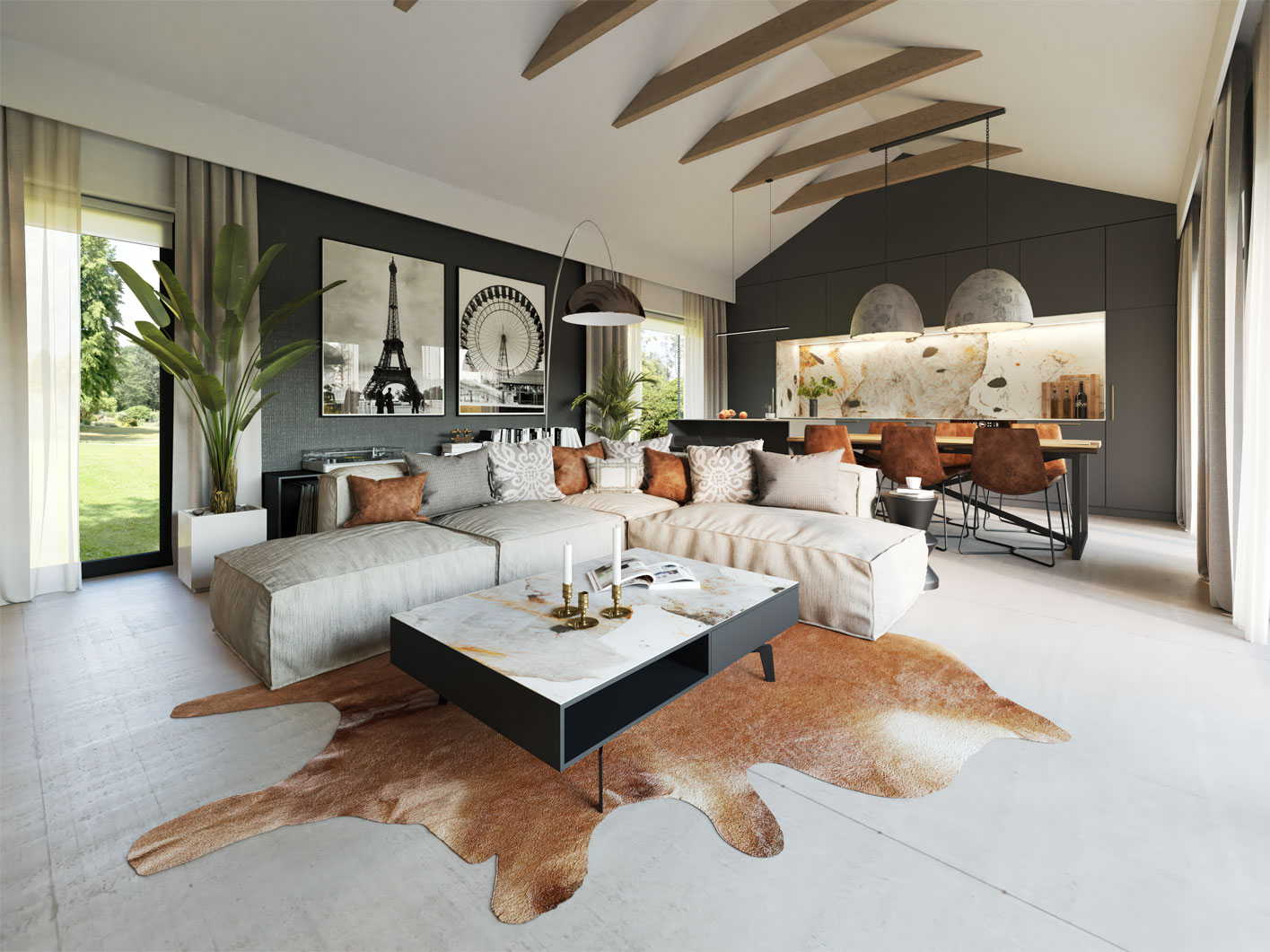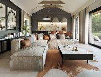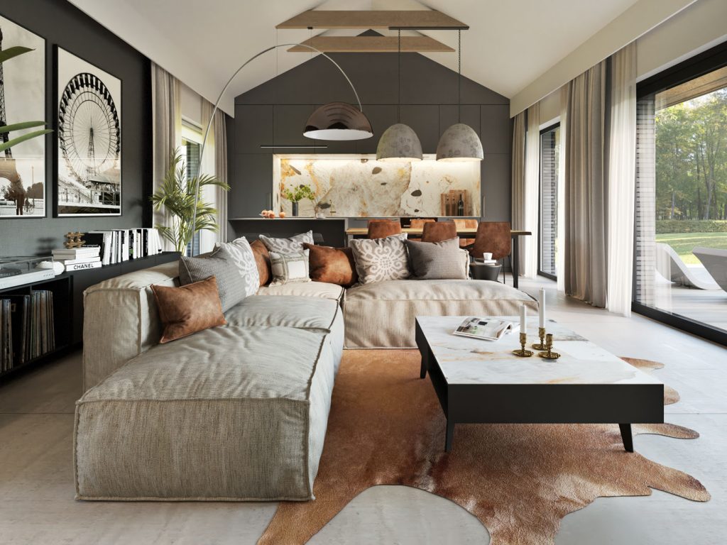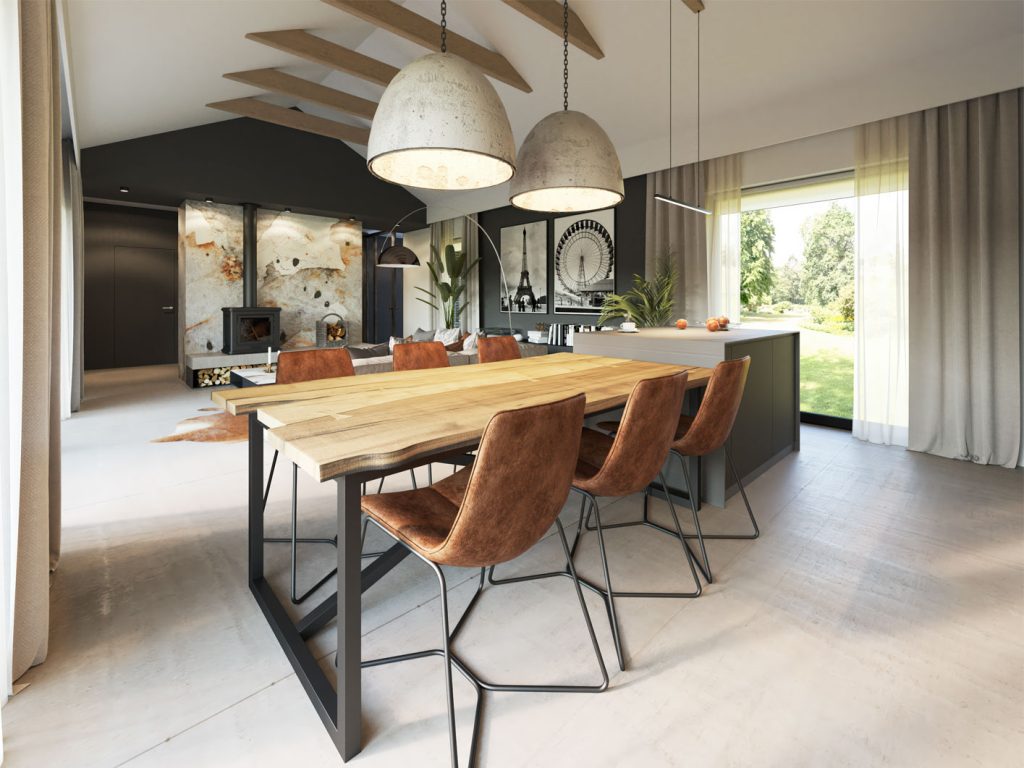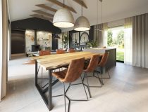 Przestronny zadaszony taras frontowy prowadzi do drzwi wejściowych za którymi znajduje się duży wiatrołap z pojemną szafą i drzwiami prowadzącymi do kotłowni. W strefie dziennej znajdziemy klimatyczny salon z kominkiem i panoramicznym przeszkleniem, jadalnię, jedną z trzech łazienek oraz kuchnię o nowoczesnym ale bardzo funkcjonalnym układzie. W części prywatnej znajdziemy sypialnie główną, dwie dziecięce sypialnie oraz dużą łazienkę z miejscem na pralnię.