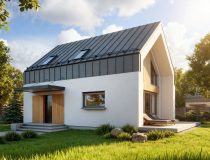Zuza to projekt niedużego domu parterowego z użytkowym poddaszem, który wpisuje się w nurt nowoczesnej architektury. Pomimo niewielkich rozmiarów projekt ten zapewnia pełen komfort mieszkania nawet 4-osobowej rodzinie. To niewielki dom parterowy o idealnie rozplanowanym układzie funkcjonalnym i nowoczesnym wyglądzie. Zuza to projekt domu, który posiada powierzchnię zabudowy do 70 m2. Daje to możliwość jego budowy na zgłoszenie. Budowa domu na zgłoszenie to jedno z założeń programu Nowy Polski Ład. Wszystkie projekty, których powierzchnia zabudowy nie przekracza 70 m2 będą mogły być realizowane bez pozwolenia na budowę. Budowa taka nie będzie również wymagała kierownika budowy oraz prowadzenia dziennika budowy. Prosta, minimalistyczna bryła na rzucie prostokąta, dwuspadowy, bezokapowy dach oraz powierzchnia użytkowa nie przekraczająca 70m2 to gwarancja niewielkich kosztów budowy. To projekt nie tylko tani i łatwy w budowie, ale również niezwykle funkcjonalny. Dom wykończono w nowoczesnym stylu. Uwagę przykuwa blacha na rąbek w kolorze antracytowym zestawiona na zasadzie kontrastu z białym tynkiem i ciepłym naturalnym drewnem. Zastosowane materiały nadają oryginalnego charakteru. Duże przeszklenia pozwalają na wprowadzenie do wnętrza dużych ilości naturalnego światła, co nie tylko sprawia, że pomieszczenia są jaśniejsze, ale także umożliwia cieszenie się widokiem otaczającego krajobrazu. Pomimo ograniczonej powierzchni użytkowej, układ funkcjonalny został starannie rozplanowany. Parter stanowi strefę dzienną z otwartą przestrzenią salonu, jadalni i kuchni. Otwarta przestrzeń to doskonałe miejsce do wspólnego spędzania czasu z rodziną. Dodatkowy pokój na parterze może pełnić różne funkcje, zależnie od potrzeb mieszkańców. Na parterze przewidziano również łazienkę oraz pomieszczenie gospodarcze, w którym zaprojektowano pompę ciepła. Na poddaszu zaprojektowano trzy funkcjonalne sypialnie, łazienkę oraz pralnię. Optymalne wykorzystanie przestrzeni na poddaszu umożliwia komfortowe warunki dla mieszkańców. Niewątpliwą zaletą projektu jest duży taras zaprojektowany w kształcie litery L. Taras okala dom z dwóch stron, dzięki czemu jest bardziej funkcjonalny. Dom o takich gabarytach to oczywiście niższe koszty zarówno w fazie budowy, jak i w trakcie późniejszej eksploatacji. Mniejsza powierzchnia zabudowy oznacza także możliwość zakupu mniejszej działki, co może wpływać na korzystniejszy wybór lokalizacji. Projekt domu Zuza to doskonałe połączenie nowoczesnego designu, funkcjonalności oraz zrównoważonego podejścia do zagadnień budowlanych, co sprawia, że stanowi on atrakcyjną opcję dla tych, którzy cenią sobie komfort życia w mniejszych, nowoczesnych domach.